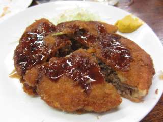 こりゃ確かにでかいわ!特大和牛メンチカツ¥500。肉をしっかり味わえます。でも、衣が堅いのが難だな! |