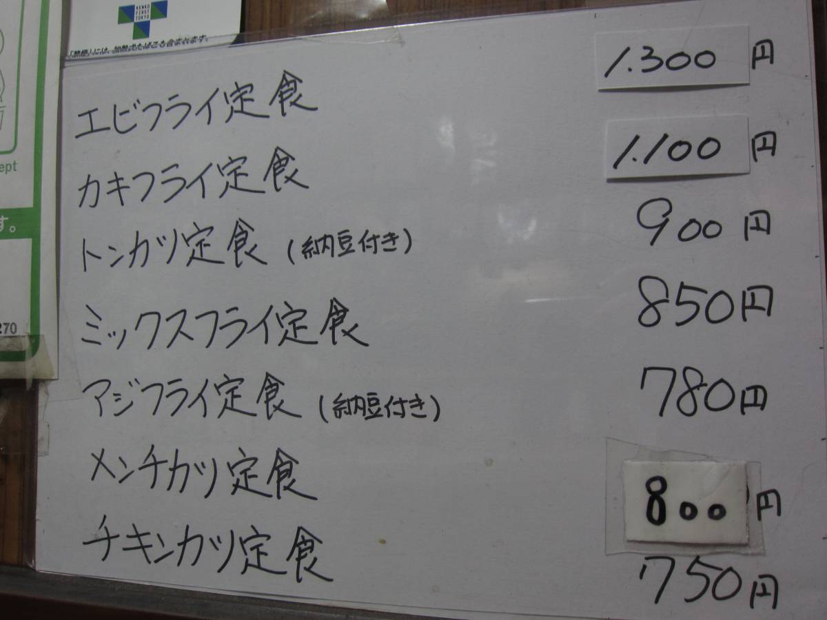 壁を見ると鄙びた食堂からは想像できないほど数が並んだ短冊メニューに驚いてしまいます。何を食べようかと迷ってしまいます。悩んだあげく選んだのは、やはり食堂での定番、とんかつ定食\800です。でも、夜は居酒屋っぽくなるみたいですね。 |