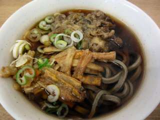 今日の一由そばは、太蕎麦\270に新メニューのもんじゃ焼の天ぷら\140を載せてみました。 |