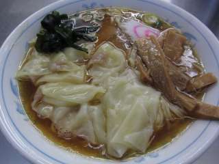 しばらくして運ばれたラーメンは、チャーシュー1枚とワンタンが6個。そしてメンマ、なると、ワカメなどが載っています。スープを啜ると、昔懐かしい、ほのぼのとした感じのさっぱりとした味です。チャーシューもしっかりと肉を感じさせるものです。メインのワンタンは具がほんの少し入っているだけのもの。まあ、6個で\50ですからね。文句は言えません。ワンコインでこれだけ食べられれば文句はありません。ごちそうさまでした。 (16.3) |
