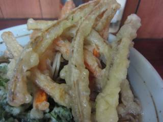 カウンターで食券を渡すと、天ぷらはどれにするかを聞かれます。かき揚げかと思っていたので、驚いてしまいます。これって、田そばと同じですね。 かき揚げ、春菊天、ごぼう天、ちくわ天などがありますが、今回は春菊天でお願いしました。 |