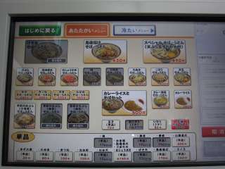 注文は券売機で食券を買う方式。苦手なタブ式なのよ(^0^;) こちらは温かい物と冷たいメニューに分かれているのね。今回は桜えび天そば\400をね。 |