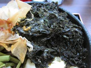 今日のあかまつは、本日のおすすめの山菜そば\800をね。 少し待って運ばれた蕎麦は、山菜だけかと思ったんだけど、とろろに岩海苔まで載ったもの。丼いっぱいに載り、そば殻見えないほど。ボリュームありすぎで、食べきるのも大変でした。 |