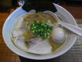 しばらくして出てきたラーメンは、濁りのある醤油スープにチャーシュー5枚と味玉、メンマ、分葱、海苔が載り、プーンと煮干しの香りが漂ってきます。けっこうアブラの浮いたスープを飲むと、やはり煮干しの味が強めで、ちょっとザラッとした舌触り。ドロッとまではいきませんがちょっと粘度のあるタイプです。うーん、やはり独特の風味のある煮干し系は苦手かな… チャーシューは厚みもありしっかりとした歯応えで食べ応えあります。麺は中太のストレート。けっこう食べ応えのあるラーメンでした。 (09.9) |