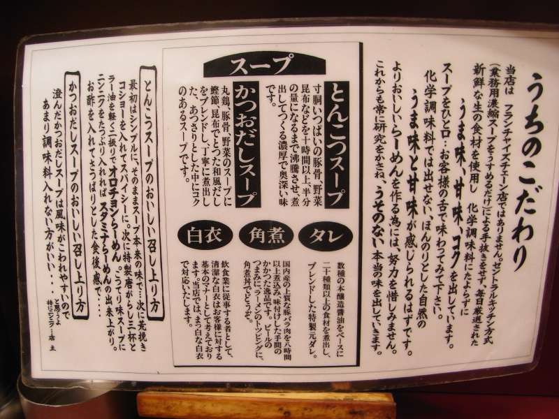店は思ったよりも広く、店員さんも多くいます。入ったのが夕方のオープン時だったので次第にお客さんが増えてくるんでしょうかね。メニューはラーメンと餃子がメインです。ラーメンのスープはとんこつとかつおだしの2つから選べます。今回は売りらしい、とんこつラーメン\600を注文しました。 |