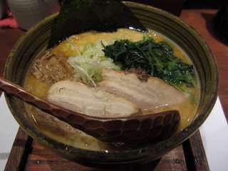 そんなに待たずに運ばれたラーメンは、すんだ透明なスープを期待していたのですが、期待を裏切る白湯スープ。そこにチャーシュー2枚と穂先メンマ、海苔、ほうれん草、刻みネギが載っています。まずはスープを啜ると、う〜ん、「鯛」というよりもやはり「とんこつ」を感じてしまいます。「鯛」の優しいダシを感じることができないのは、私の舌がよくないからでしょうね。そして、ピリッと胡椒の辛みも時折感じました。 麺は中太で加水率高めのもの。これはモチモチッとして好みでした。チャーシューはホロッと崩れるタイプ。もうちょっと肉を感じさせてくれると嬉しいです。ごちそうさまでした。 (12.9) |
