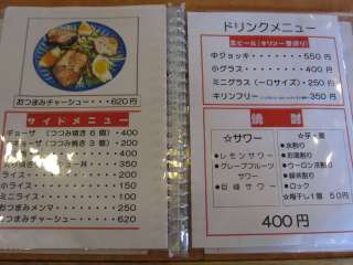 注文は席で店員さんに直接し、精算も席で行う方式です。いろいろあるメニューから何を食べようかと迷ってしまいます。醤油、塩、味噌と味を選べる上、麺も細麺と中太麺から選べます。そしていろいろなバリエーション。けっきょく、醤油のねぎラーメン\880を細麺でいただくことにしましたが、細麺と中太麺は麺量が違うからか、中太麺の方がお高いのは残念です。 |