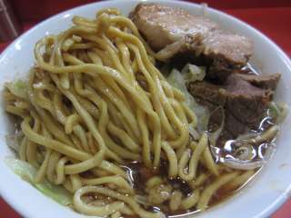 超久々の再訪です。いつもは開店時から混んでいるのですが、さすがに夏は混んでいないだろうと思って寄ったのですが、それなりに混んでいるのはさすがです。今回は豚入りラーメン\800をいただきました。 それなりに待った後に運ばれた今まで以上に濃い色のスープ。けっこうしょっぱめです。乳化度も低いように思えます。麺は相変わらずの極太麺。濃いめのスープが染み込み、二郎らしさを演出しています。豚は5枚。味が抜けきらずに固すぎず、柔らかすぎずで美味しいんですよ。ごちそうさまでした。 (13.8) |