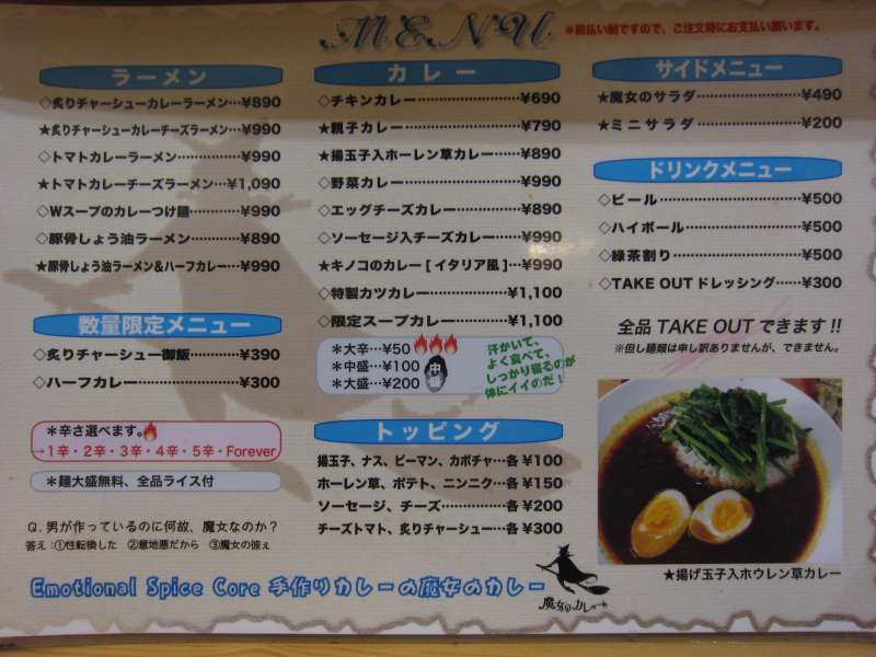 | 以前訪れたラーメン二郎のすぐ隣にあるカレー屋さんです。小さな店ですが、奥にある券売機で食券を買うシステムです。そんな必要ないようにも思うんですが… でも、なんで魔女なのかな〜 メルヘンチックな造りでもないし… メニューはチキンカレー\690、親子カレー\790、揚玉子とポウレン草のカレー\860などなど。チキンカレーをベースにトッピングでいろいろと楽しめるようです。変わったところではカレー屋さんなのに、炙りチャーシューカレーラーメン\880、炙りチャーシューカレーチーズラーメンなんてものもありました。今回はチキンカレーに揚玉子を載せた親子カレーを注文しました。 |