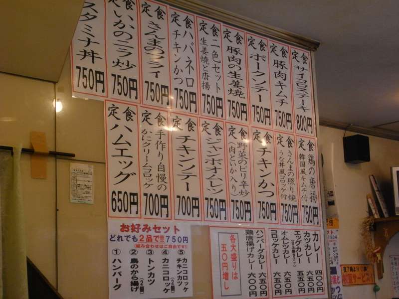 メニューは基本的に丸高食堂と同じようです。もちろんこちらにもワンコインサービスがあります。でも、丸高食堂とは変えているようです。訪れた日のワンコインサービスは、唐揚げと生姜焼き定食でした。 |