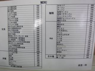 メニューは定食が中心ですが、ラーメンやカツ丼などの丼物も揃っていて、いかにも街の食堂って感じです。今回は日替わり定食の肉ニラ炒め定食\750をいただくことにしましたが、メニューの中から日替わりで少し割り引いている目玉メニューのようです。 |