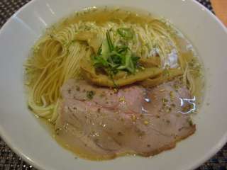 今日も限定メニューがあると聞き、休日出勤の途中に訪れました。今日のメニューは澄みきりの塩そば\850だそうです。鯛などの白身の干し魚の水出しのスープだそうです。合わせて釜揚げしらすと小海老丼\150も追加してしまいました。 程なくして運ばれたラーメンは、確かに透明なスープに肉団子?が2つと白髪ネギのごくシンプルなもの。まずはスープを啜ると、わずかに魚の強めの香りが漂います。でも、スープ自体はあっさりとしたものでくせは感じません。なので、今までの煮干し出しのラーメンと比べるとあっさりしすぎかな?肉団子は生姜が利いたもの。なかなか美味しかったです。 |