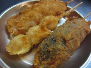 今日の肴は揚げ物シリーズ!ということで、まずは赤ウインナーフライ、小芋フライからです。赤ウインナーフライは昔懐かしい赤ウインナーの串揚げです。小さめの赤ウインナーが3つ串刺しになっています。なんか子どもの頃の弁当を思い出しますね。小芋フライはてっきりじゃがいもどと思い込んでいたのですが、里芋でした。つるんと口の中に入り、あの独特のぬるっとした歯応えがいいですね。でも、里芋のフライは初めてだ! |