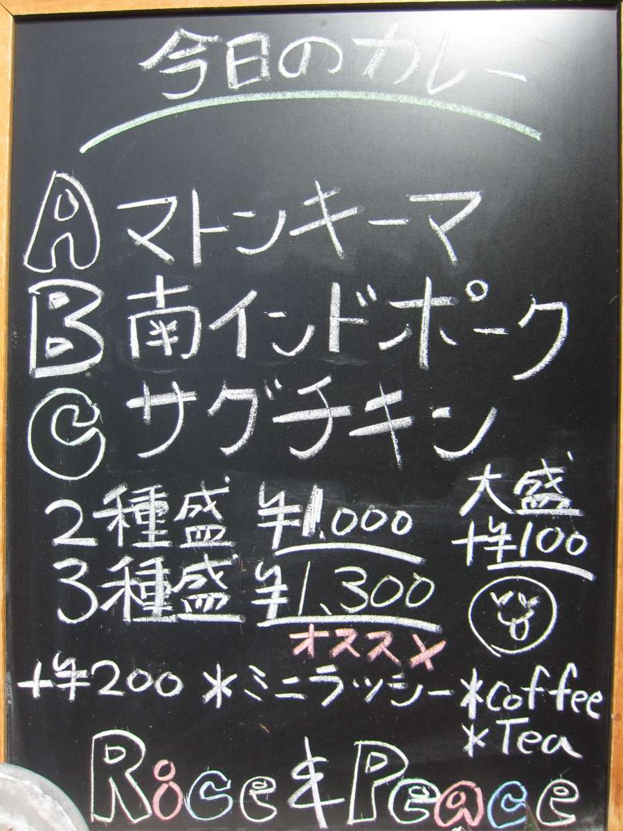 メニューは日替わりで3種類用意しているそうです。この日はマトンキーマ、南インドポークに海老グリーン。1つのカレーだけでなく、2・3種盛りにも対応してくれるそうです。今回は初めてなので、無難な?南インドポークカレー\800にしてみました。 |