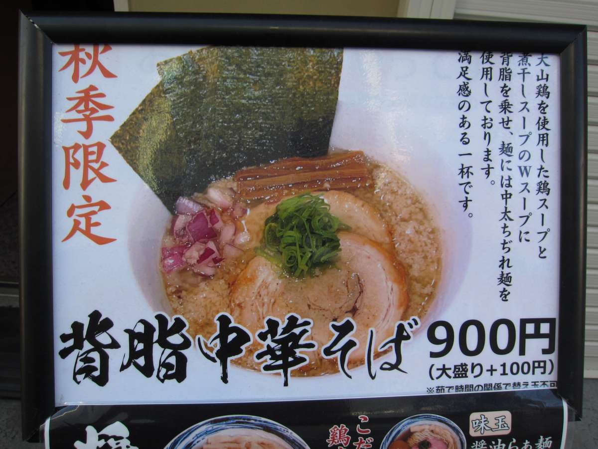 期間限定メニューも色々とあるみたい。今回は期間限定の背脂中華そば\900をね。 |