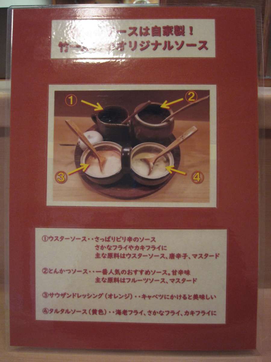 ウスターソース、とんかつソース、サウザンドレッシング、タルタルソース、からしの調味料セット。サウザンドレッシング、タルタルソ−スは手作り感たっぷりですね。 |