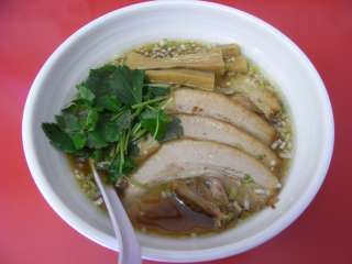 注文は入口横にある券売機で食券を買う方式です。醤油、塩、魚介とんこつ、ベジポタとんこつ、つけ麺といろいろなラーメンがあってどれを食べようかと迷ってしまいます。けっきょく基本の醤油のちゃーしゅーめん\900にしました。 |