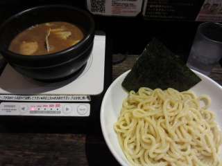 けっこう待った後にまずはつけ汁が運ばれました。この店で変わっているのは、IHヒーターが各席に備え付けられていて、つけ汁の器をこのIHヒーターで温めて食べるようになっていることです。IHヒーターに器を載せると、すぐにつけ汁はぼこぼこと沸騰します。これで熱々のつけ汁で食べられるって訳です。なかなかいいアイデアですね。 続いて麺が運ばれました。麺には海苔が載っているだけで、つけ汁に味玉とチャーシュー、メンマが沈んでいます。まずはつけ汁を啜ってみると、名の通り、とてもドロッとして魚介の香りが漂うものです。みじん切りのタマネギも入っていました。最近流行のタイプですね。麺をつけると本当によく絡みます。濃厚な魚介風味は美味しいですが、具はチャーシュー1枚と大きめなメンマが1つだけ。ちょっとコストパフォーマンスは悪いかな。 (11.11) |