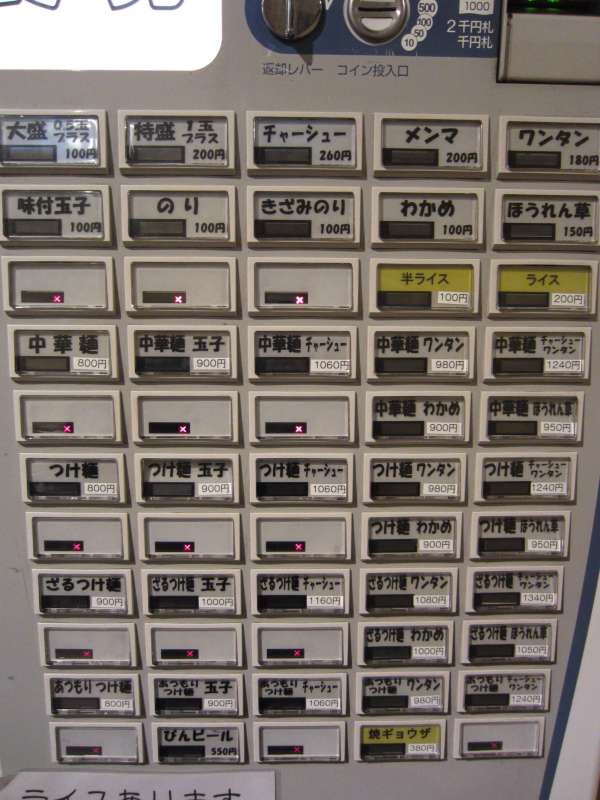 注文は入口にある券売機で食券を買う方式です。メインの中華麺\800、中華麺チャーシュー\1060などがあります。永福町にはないつけ麺やざるつけ麺もありました。今回は中華麺を食べることにしました。 |