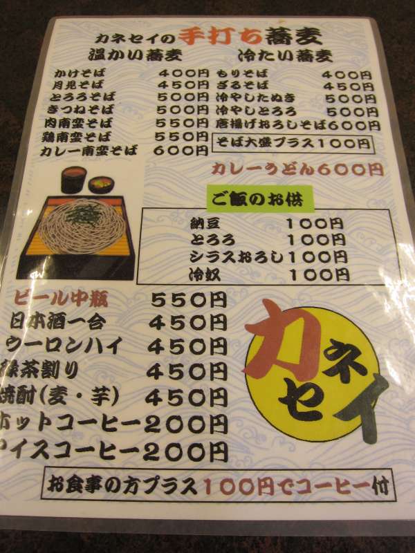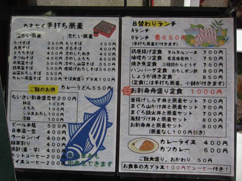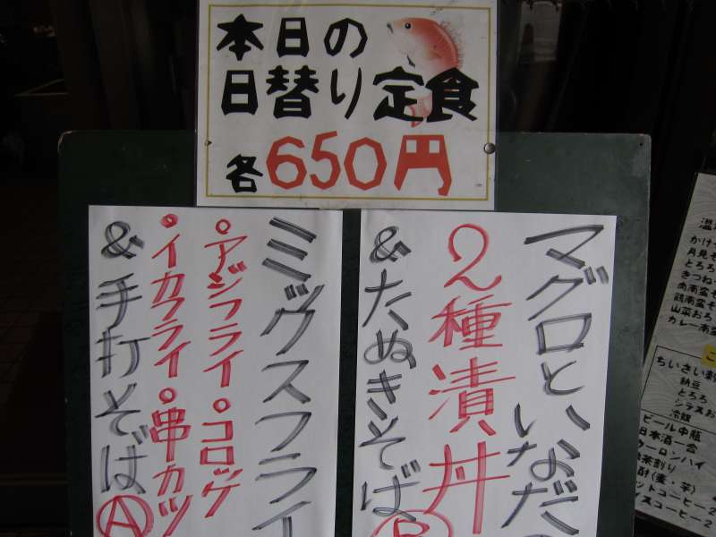 久しぶりの再訪です。今日は魚を食べたくなって訪れた。お値段もちょっと上がっていますね。注文は当然、お刺身舟盛り定食¥1100を蕎麦抜きでお願いし、¥1000となりました。 |