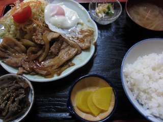 けっこうな待ち時間のあとに運ばれた定食は、ややお値段高いこともあってか、かなりのボリュームです。メインの焼肉は肉厚で大きめな肉が5枚ほど。それに目玉焼きや小鉢が付いたもの。これなら納得ですかね。 やや甘めのタレであじつけされた焼肉はご飯がすすみます。多目と思ったご飯もけっこう楽にお腹の中に吸い込まれていきました。美味しくいたただくことができ、満足でした。ごちそうさまでした。 (17.6) |