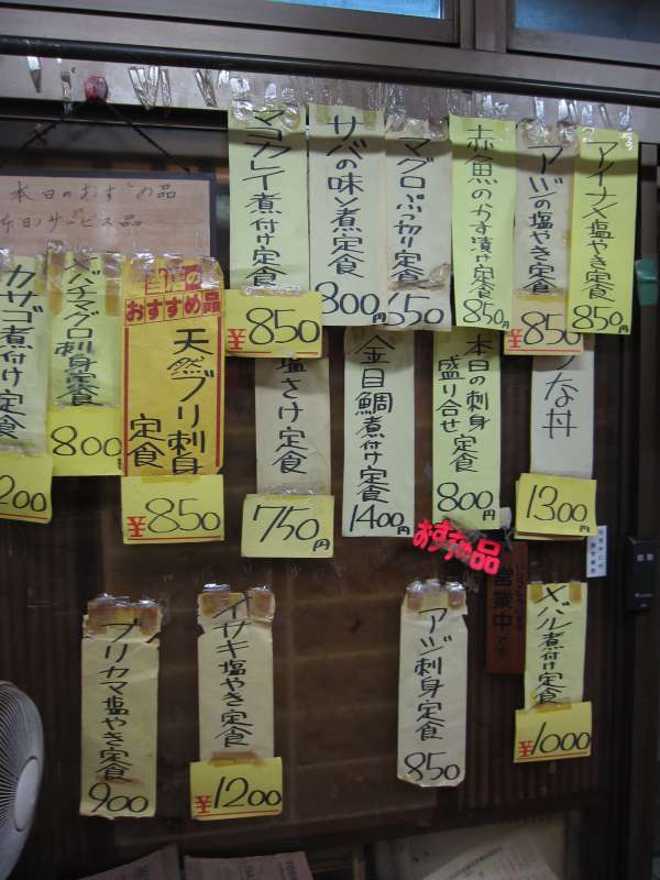 店内も外観と同様で、メニューは短冊メニュー。魚系が多いですね。何を食べようかと迷いましたが、定番のサバの味そ煮定食\800をいただくことにしました。 |