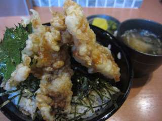 蕎麦屋ですが、今回は店頭の「天丼」のポップに引かれて入ってしまったので、注文は当然のことながら穴子天丼\680で決まりです。 やや待って運ばれた穴子天丼は\680とは思えないボリュームです。穴子が3切れと大葉の天ぷらが載っています。たれはやや甘めかな?天ぷらもサクッと揚がっていて、美味しくいただくことができました。ごちそうさまでした。 (16.10) |