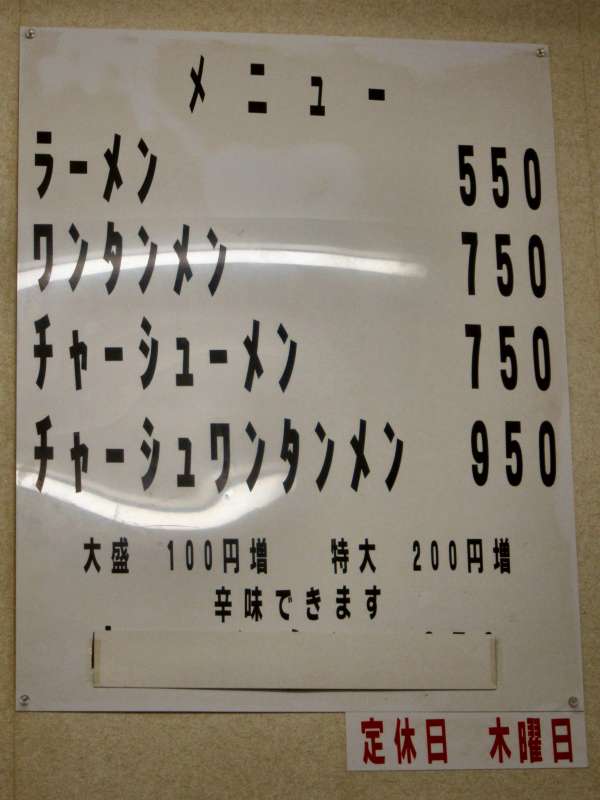 上野原市の住宅街の中にポツンと建つラーメン屋です。自宅の中庭にラーメン屋を造ったような感じです。飲食店なんか成り立ちもしなさそうな場所ですが、人気店らしく引きも切らさずお客さんが来ています。店内は写真撮影禁止とのことなので、今回は外観写真のみです(^^;) メニューはラーメン\550、ワンタンメン\750、チャーシューメン\750、チャーシューワンタンメン\950と至ってシンプルなメニューです。今回はチャーシューメンを食べることにしました。 けっこう待って運ばれたチャーシューメンは、なみなみと注がれたスープをこぼさないようにするだけで大変です。けっこう濃いめのスープにはアブラが多めに浮いています。スープを啜ると、濃いめの醤油ダレにもかかわらずアブラのせいか甘味を感じます。ちょっと不思議な感じのスープです。 麺の上には厚めのチャーシューが4枚と濃いめに色がついたメンマ、海苔、もやし、刻みネギが載っています。チャーシューはバラ肉で厚めであるだけでなく、大きく食べ応え十分です。しかも美味しい!しっかりと満足です。麺は手打ち風のちぢれのある太麺。白河ラーメンの麺のような感じです。ちょっと柔らかめに茹で上げられています。スープもかなり濃いめなので麺が勝っていることもなく、ちょうどいい塩梅かも。 (10.10) |