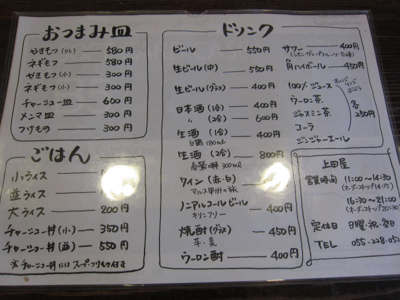 メニューはラーメンを中心にワンタンメン、チャーシューメンなどがあります。今回はチャーシューメン\830とクルマなので飲めないのが分かっているのに、ついついネギもつ(小)\300も注文してしまいました。 |