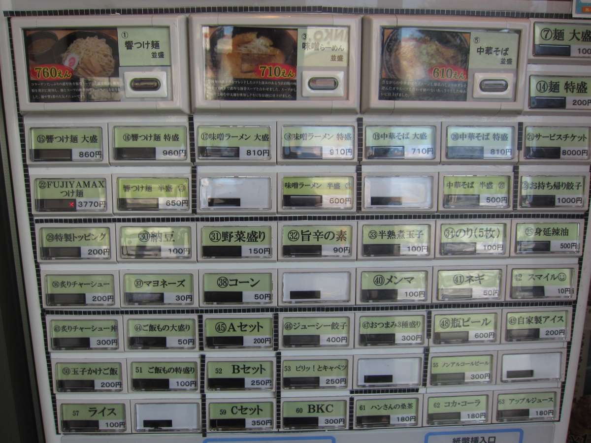 注文は券売機で食券を買う方式。メニューは、つけ麺が売りのようで、他に味噌らーめんと中華そばもあります。今回は売りらしい響つけ麺\760に特製トッピング\200を追加してみました。 |