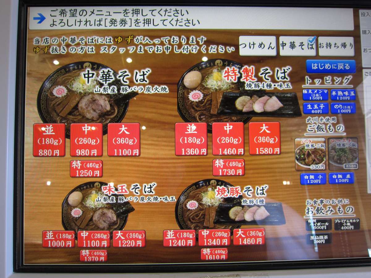 甲府を訪れたので久々の再訪です。昼過ぎに訪れてのですが、並びが無くて、ラッキー!と思ったら、束の間の糠喜び(>o<) 松戸の本店同様に予約制になったのですと!予約受付開始は9時からだそうですが、この日は待ちが30分だったので当然ね! 今回は中華そば並\880ね。 |