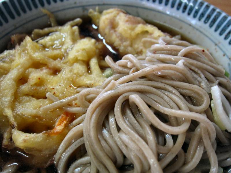 そう待たずに運ばれた蕎麦は、小さめなかき揚げと長さ半分のちくわ天が載ったもの。 |