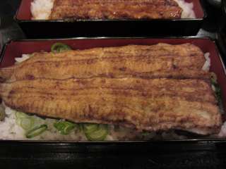 そして〆のウナギは、タレ焼きと白焼きのコンビネーションである金銀鰻重\4750を食べることにしていました。でも、訪れた日はすでに通常使うウナギが売りきれとのこと。でも、+\500で特特上に使うウナギで食べさせてくれるとのこと。もちろん、こちらでお願いしました。 |