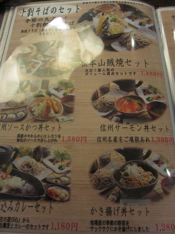 元々が蕎麦屋ということでメニューは蕎麦がメインですが、伊那ソースカツ丼、信州サーモン丼、松本山賊焼きなど信州の名物B級グルメも揃っています。さんざん悩んだあげく注文したのは、食べたいと思っていた松本山賊焼きと十割蕎麦がセットになった松本山賊焼セット\1480です。 |