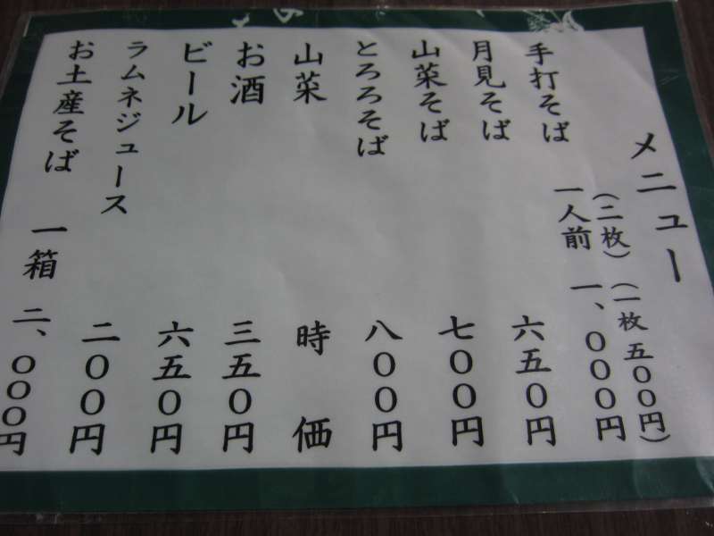 メニューは手打そば\1000(二枚)と月見そば\650、山菜そば\700、とろろそば\800しかありません。今回は手打そば\1000をいただきました。 |