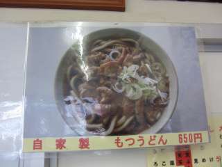 メニューは蕎麦とうどんから選べて、具は、かき揚げとか山菜とかね。きのこにもそそられたんだけど、今回はもつ煮が載った、もつそば\650をね。 |