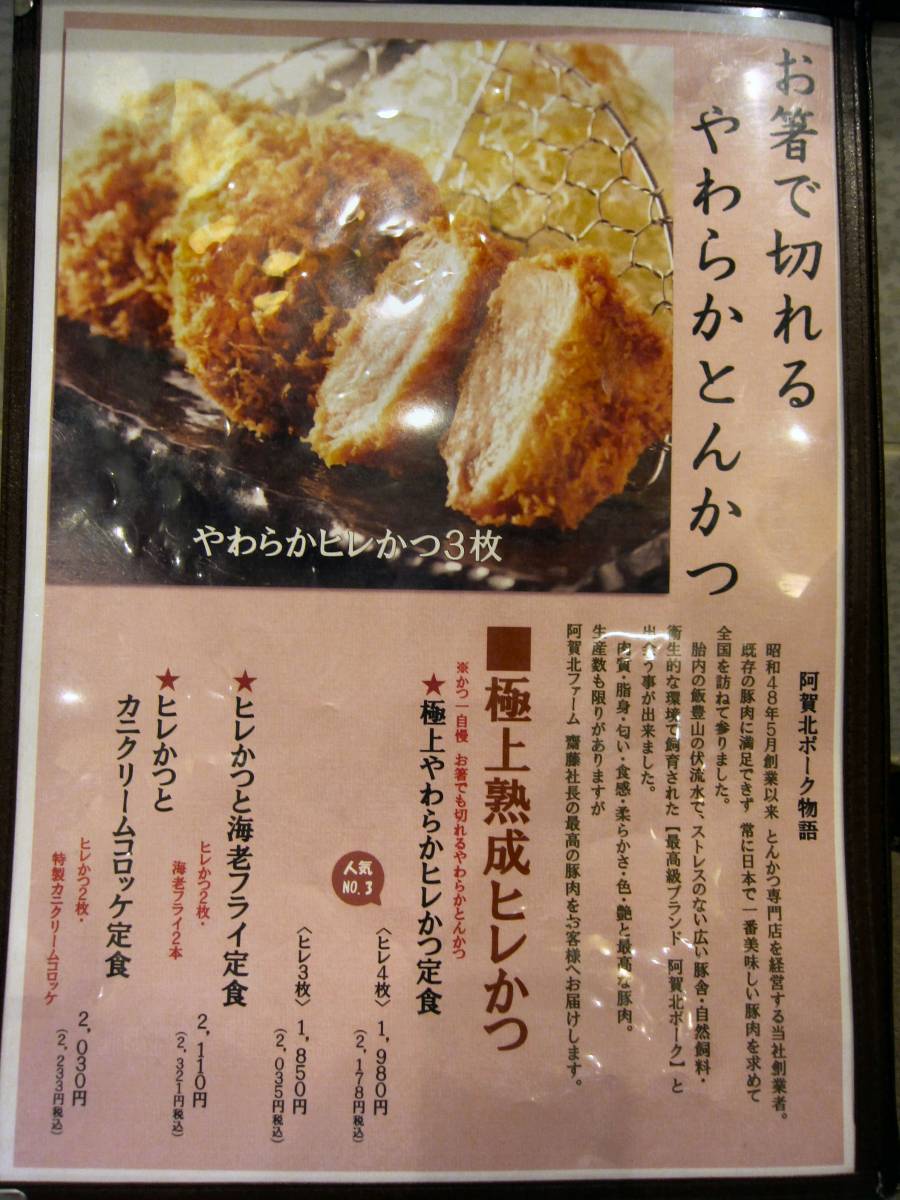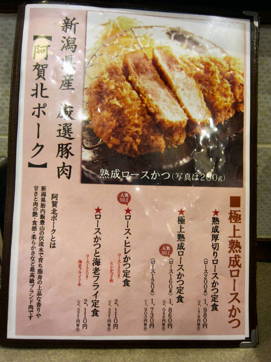 メニューはシンプルにロース系と一口かつ系のとんかつにタレカツ重に魚介系のフライなどがあります。ややお値段も高めですね。注文はもちろん、タレカツ重\2035をね。 |
