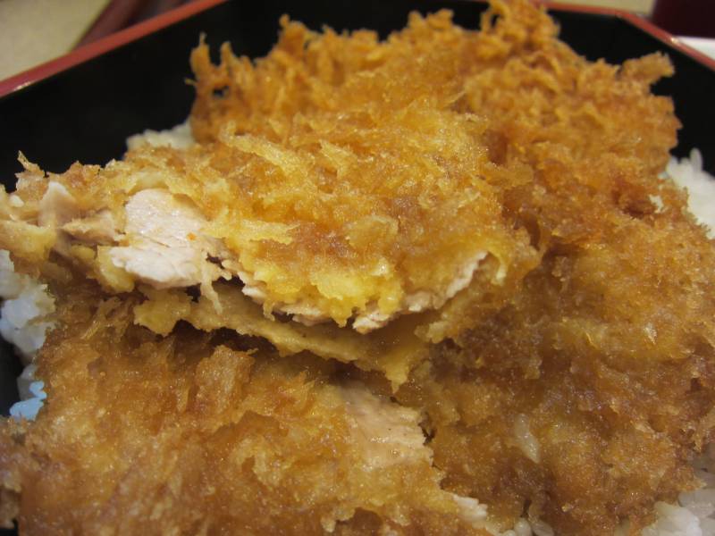 「丼」ではなく「お重」に盛られたタレカツはなんか、上品な感じ。ご飯も盛りは少なめかな? ややうす目のひれかつは3枚盛り。肉は柔らかくて食べやすいですね。でも、軽いアブラなんだけど、油切りが十分ではないのか、タレとアブラがご飯に染み込みすぎて、ご飯がアブラっぽくなってしまっていてね。モタれるほどではないけどね。飽きるっていうのかね。 |