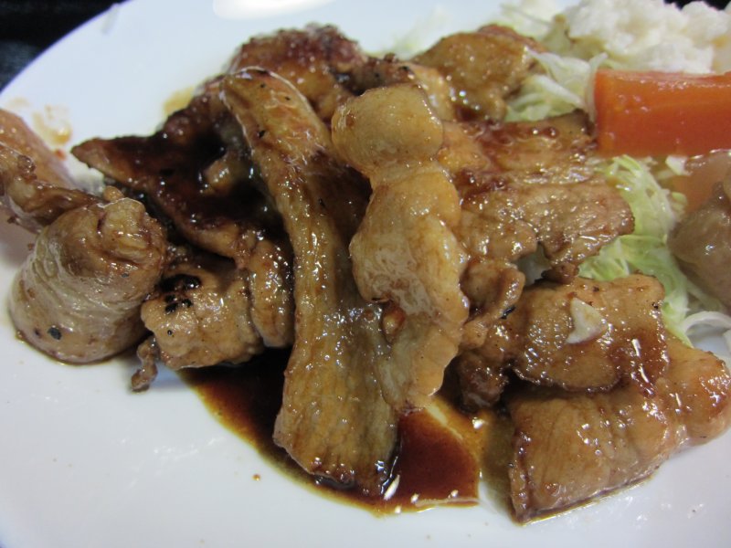 すぐに運ばれた定食は、小さめだけど厚みのある肉がお値段考えるとかなりの数が盛られています。 |