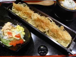 東海道本線富士駅から2km弱。住宅地の中にひっそりと建つ居酒屋です。看板も小さく、気をつけていないと見過ごしてしまうような、民家のような店です。でも店の中に入ると座敷にテーブルが数客とカウンターが数席。そこが満席になってしまうほどの人気の店です。 さて、この店を訪れたのは、酒を飲むためではなく、吉原の新名物、つけナポリタンなるものを食するためです。つけナポリタンとは、吉原の商店街が地域の新名物を作ろうということでテレビの企画で作られたものだそうです。いくつかの店で食べることができるのですが、この遊々庵のものが美味しそうだったので寄ってみました。メニューを開くと酒飲みには目の毒になりそうなくらい美味しそうな肴が並んでいます。ビールも飲みたい… でもクルマで帰らなければならないので、アルコールはぐっとガマンしてウーロン茶とともに気になるものをいくつか注文しました。頼んだものは、白魚の塩辛\400。そして静岡名物の黒はんぺんフライ\600。最後にメインの?つけナポリタン\1200で締めました。 |