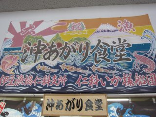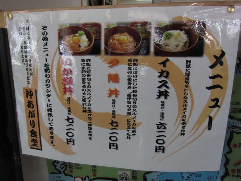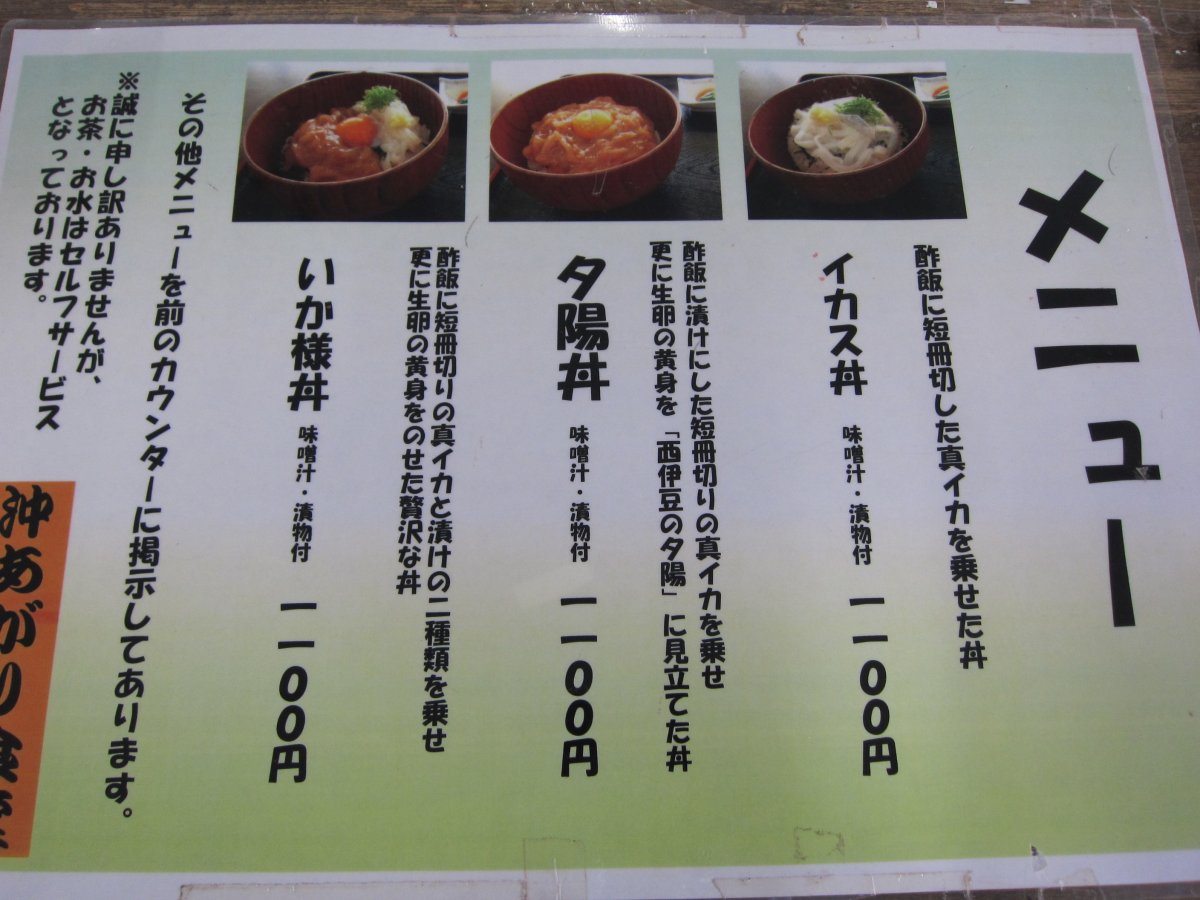 こちらは現金先払い方式。メニューは漁獲によって変わるので、いつも同じものを食べられるとは限らないみたい。でも、いかのメニューがメインですね。この日は丼物の3つしかなかったので、夕陽丼\1100をね。 |