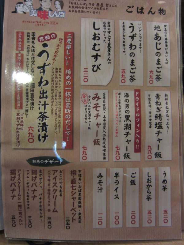 訳の分からないものの一つが「うずわ」!今回はうずわのたたき\690をいただいてみました。「うずわ」とは伊東近辺の読み方だそうで、一般にはソウダガツオのことだそうです。ソウダガツオは傷みが早く、生での流通はあまりないそうなので、珍しいといえば珍しい魚ということなんでしょうかね。 うずわのたたきは青唐辛子が入り、かなり辛口です。酒にも合いますが、ご飯も合いそうです。 |
