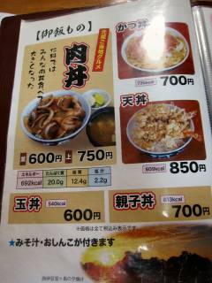 こちらが河津屋食堂のメインメニュー。、どれも安くてね。で、今回はこちらの売りでもある、肉丼\600をね。「並」と「上」があるけど、「上」は、うな重の「まむし」みたいにご飯の間にも肉が入るみたい。今回は「並」でね。 |