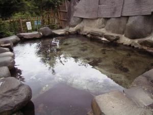 露天風呂はコンクリート造りで周りに岩が配置してあります。こちらには無色透明の単純温泉が引かれています。こちらの湯はちょっとぬるめ。そして浅めの湯船です。川岸に位置し、川の流れの音を聞いていると、何ともいい気持ちになり、いつの間にかウトウトとしてしまいました。 |