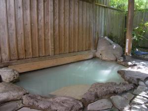 露天風呂は岩造りで3〜4人が浸かれる大きさ。大きくはありません。宿の規模を考えると妥当なところでしょうか。湯は無色透明に見えますが、湯に浸かると湯の花が舞い上がり乳白色になります。湯を口に含んでもにおいや味を感じない湯でした。 |