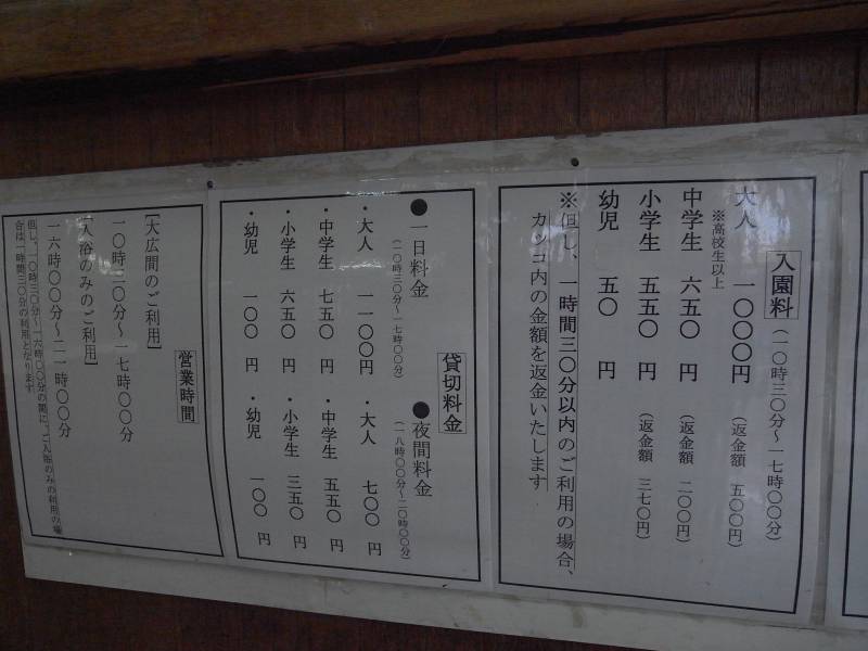 東横線綱島駅のすぐそば、綱島街道沿いにある日帰り温泉です。東京周辺ではけっこう有名な温泉なのですが、今までなかなか行く機会がなかった温泉です。 施設は大きく、受付で入浴料800円を払って入ります。中に入ると売店があるのですが、並んでいるものが鄙びた温泉場にあるようなものばかりで、さらにお年寄りが多いこともあって、ほんとに都会の温泉なのかな?と思ってしまいました。 脱衣所にはなぜか番台があり、タオルなどはここで買えます。浴室中央には直径6mほどの湯船があります。湯は黒湯で透明度15cmほど、比較的ぬるめの湯なのでのんびりすることができました。 最後に驚いたのは、入浴時間が1時間以内だと休憩しなかった分の410円を返金されるということです。受付で入浴券を見せると返金されます。銭湯料金で手軽に楽しめる湯でした。 なお、16時以降は銭湯として営業しています。 |