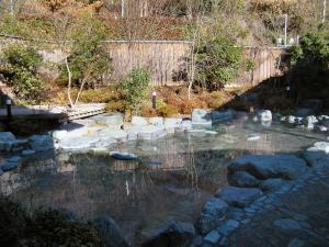 こちらの露天風呂は15〜6人が浸かれる大きさ。内湯と同じく「金の湯」と呼ばれる湯が注がれています。 |