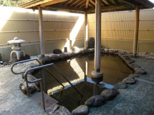 露天風呂は岩が配置された12〜3人が浸かれる大きさのもの。こちらの方がぬるめです。湯は加熱循環されていますが、塩素臭は感じません。湯を口に含んでみるとけっこうな苦みとともに塩分を感じる個性的なものです。分析表を見ると、かなりの塩分を含んだ濃い湯でした。 |
