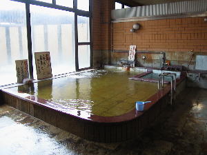 | 寿司屋の中にある温泉なので、こぢんまりした浴室かと思っていたのですが、かなりの大きさにびっくりしました。 内湯は15人くらいは浸かることのできる大きさです。黄褐色のちょっと熱めの湯がかけ流しになっています。 |