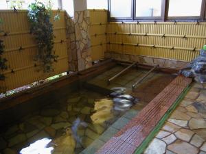 | 浴室には3つの湯船があり、少しずつ湯温が異なっており、ぬるめの湯船の一部は寝湯になっています。 浴室の壁には以前と同じようにテレビが置かれ、ぬる湯にじっくりと浸かりながらテレビを楽しむことができるようになっています。 湯はわずかに濁り気のある透明。源泉は冷たいので加熱しているようですが、かけ流しになっています。わずかに玉子臭を感じ、すべすべ感のある湯でした。 |